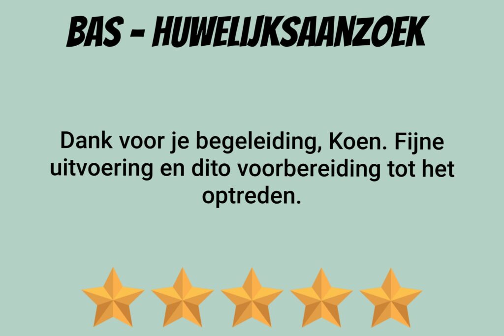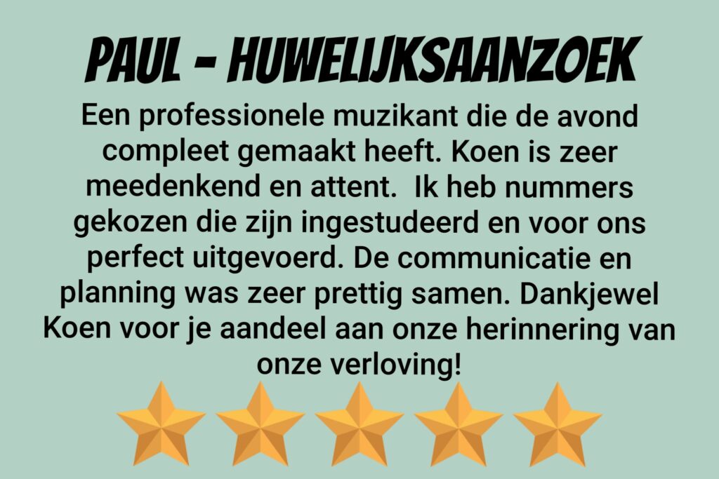 Op zoek naar muziek voor een bijzondere gebeurtenis? Koen is flexibel en denkt graag mee. Denk bijvoorbeeld aan een huwelijksaanzoek. Bespreek je/jullie favoriete liedjes en kies samen de liedjes uit die Koen komt spelen op jouw gekozen locatie. Bijvoorbeeld als toevallige ‘straatmuzikant’.