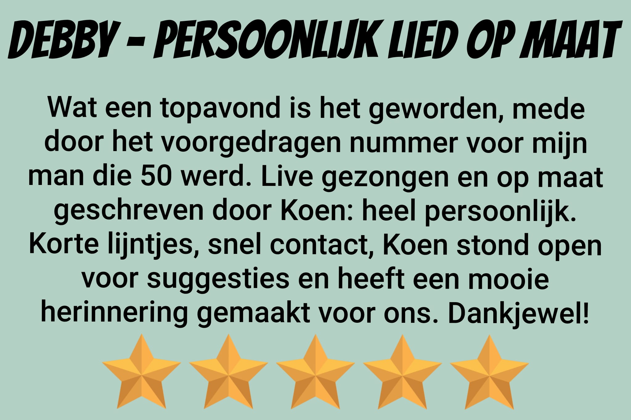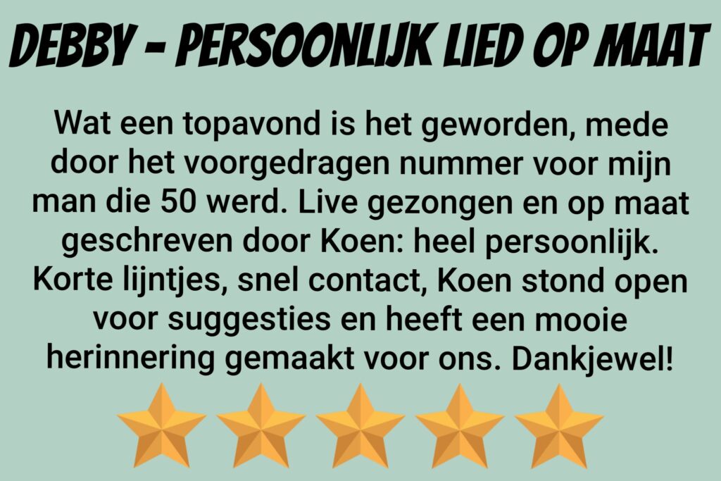 Op zoek naar een persoonlijk lied voor een verjaardag, huwelijk, of iemand die afscheid neemt op je werk? Zoek niet verder: Ik maak het voor je! Alles is mogelijk: een compleet nieuw nummer of een nieuwe, persoonlijke tekst op een bestaande melodie! Als jij voor leuke, persoonlijke informatie over de persoon, het stel, of de organisatie geeft maakt Koen er een mooi liedje van.